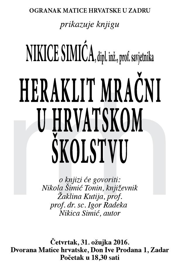 PRIKAZ KNJIGE NIKICE SIMIĆA: “HERAKLIT MRAČNI U HRVATSKOM ŠKOLSTVU”